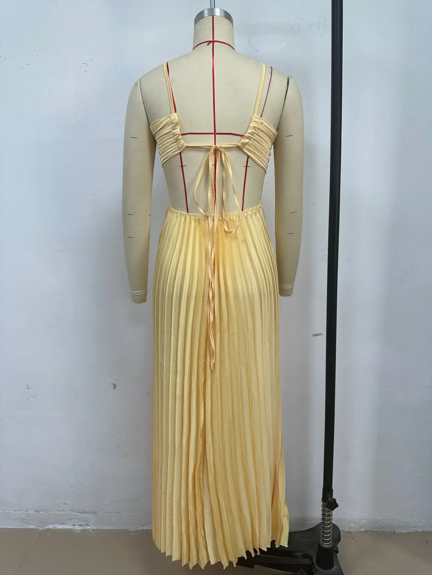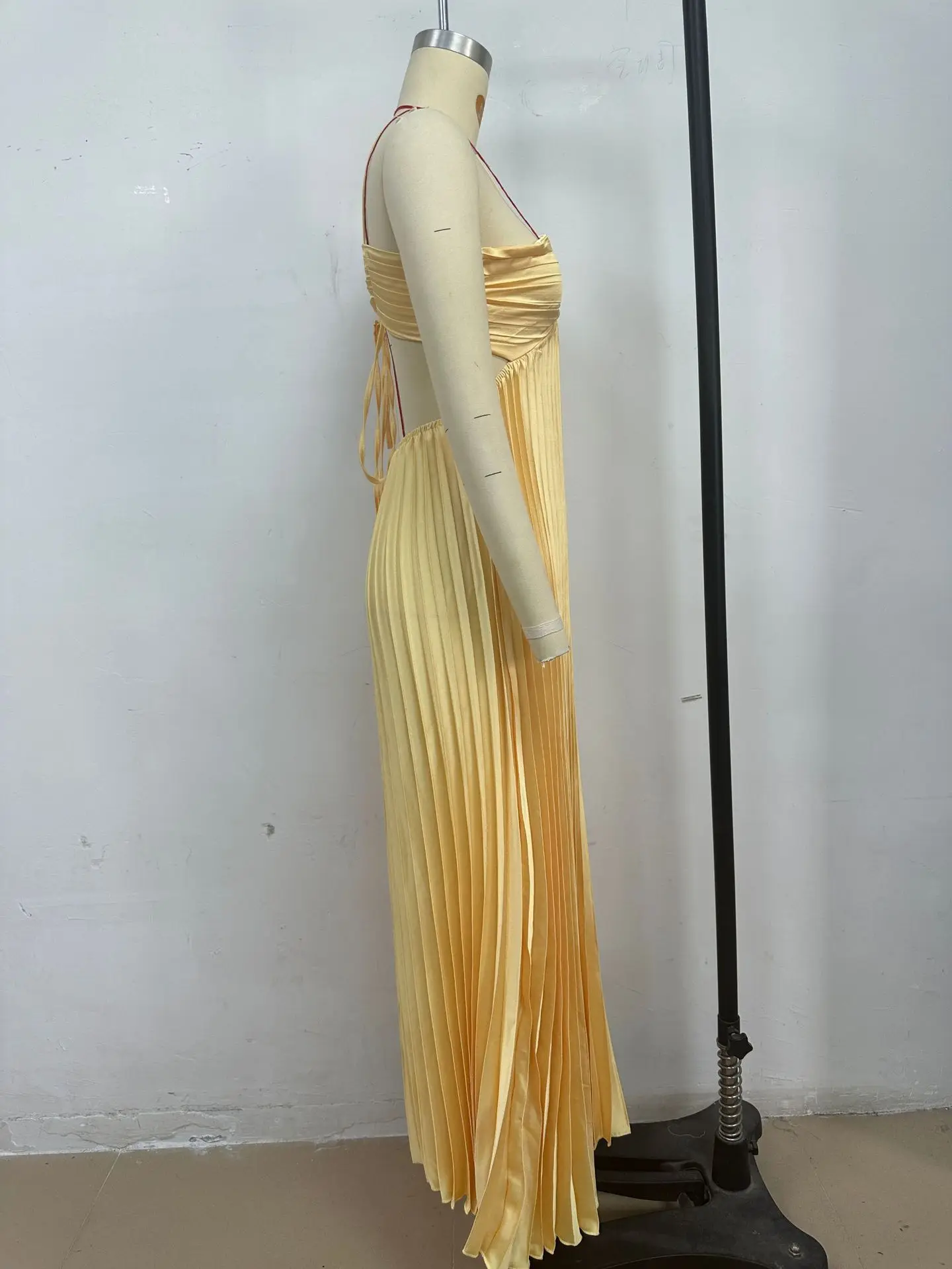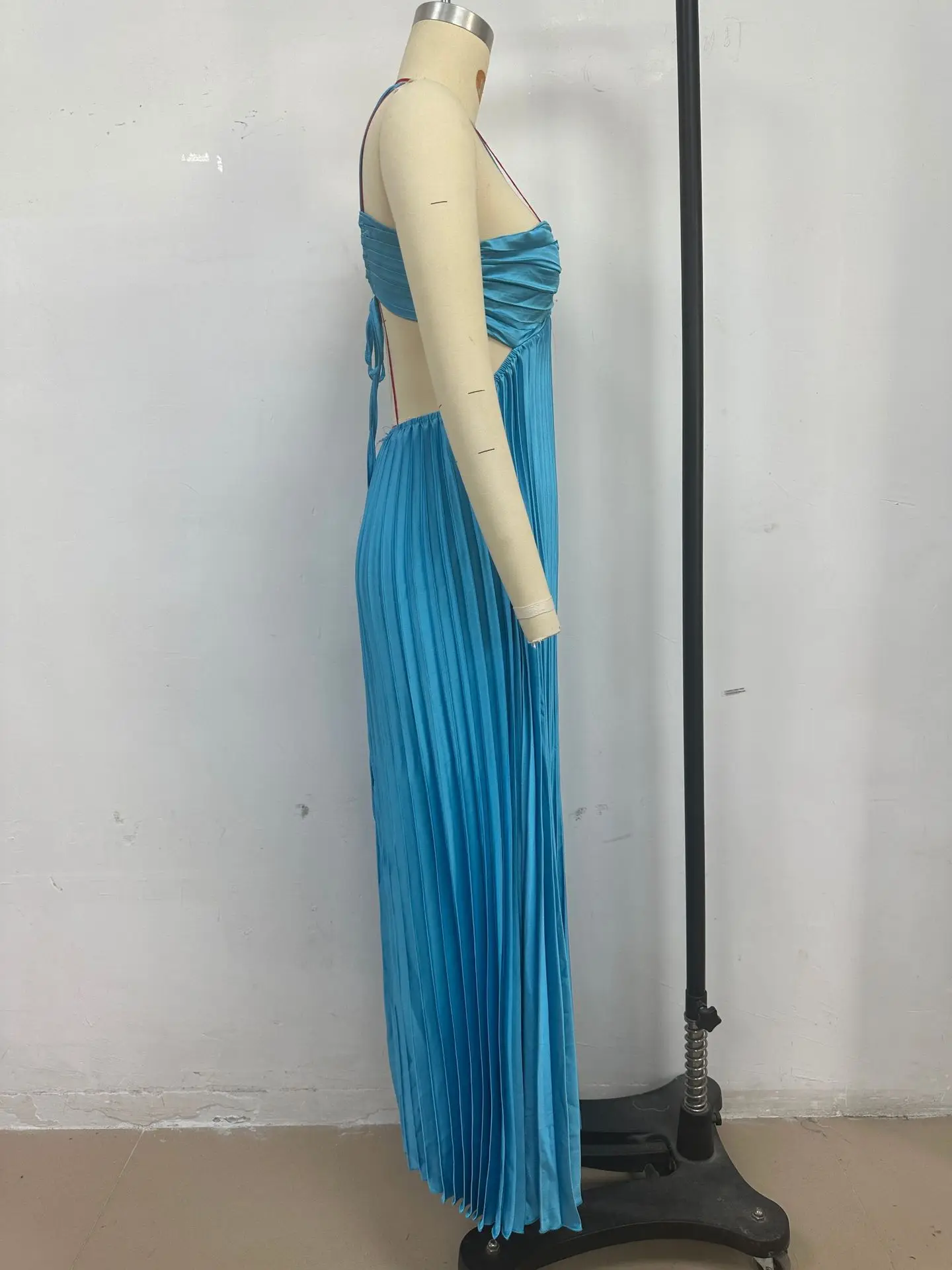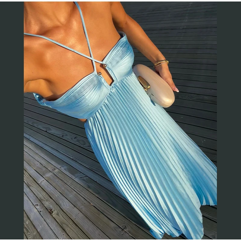 Summer Halter Pleated Long Dress Women Backless Sleeveless Blue Beach Vacation Dresses Female 2025 Fashion Lady A-line Robes